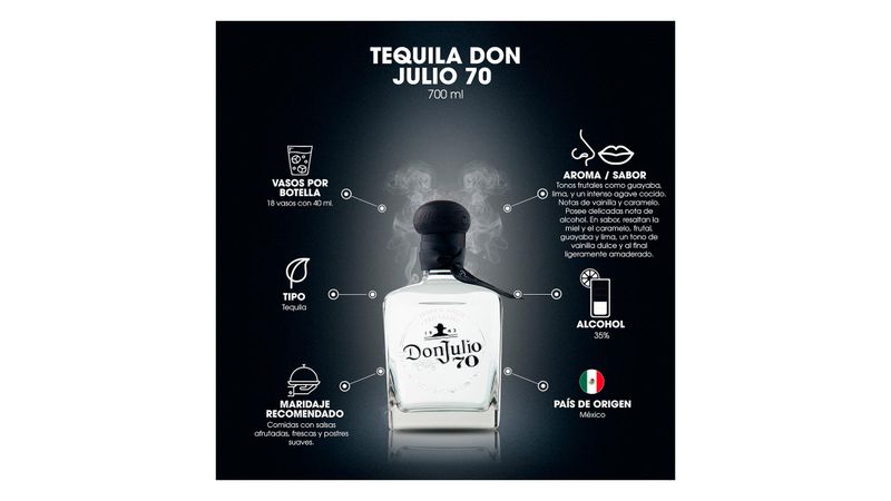 Origen: #MéxicoDisfruta de Don Julio 70, el primer tequila añejado cristalino del mundo. Cuenta con un añejamiento en barricas de roble blanco, el cual destaca por sus tonos frutales, así como cítricos con un toque dulce de vainilla y caramelo, ligeramente amaderado. Don Julio 70 es conocido por su sabor suave, con final limpio, ideal para disfrutarse solo. Consumir con precaución, exclusivamente para mayores de edad